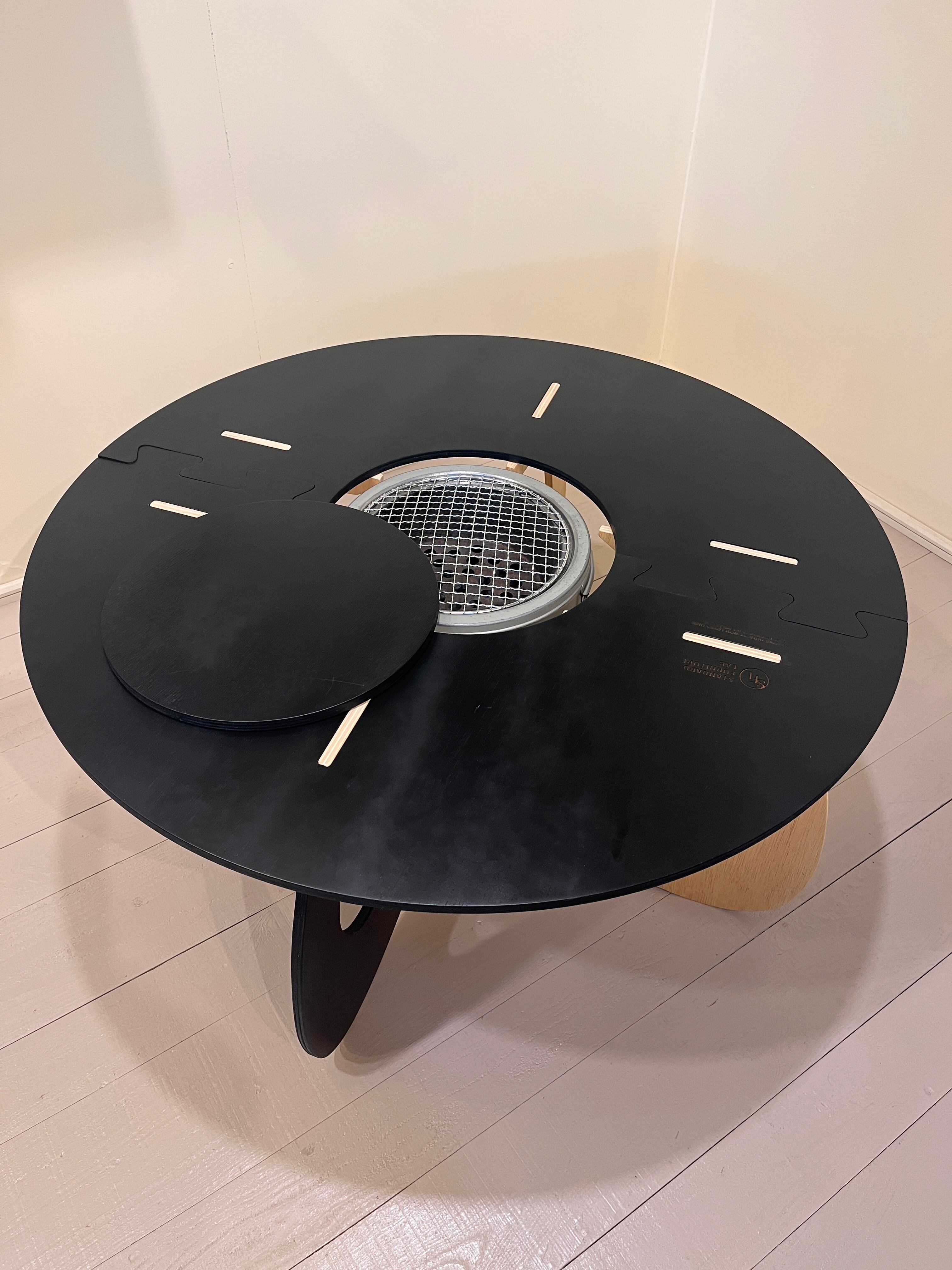 ※写真のグリルコンロは付属しておりません。センター穴の大きさは約30㎝です。市販の七輪や丸形卓上グリルコンロ(ONOE、ホンマ製作所、CAPTAIN STAG、コーナン等々)を入れて使用できます。