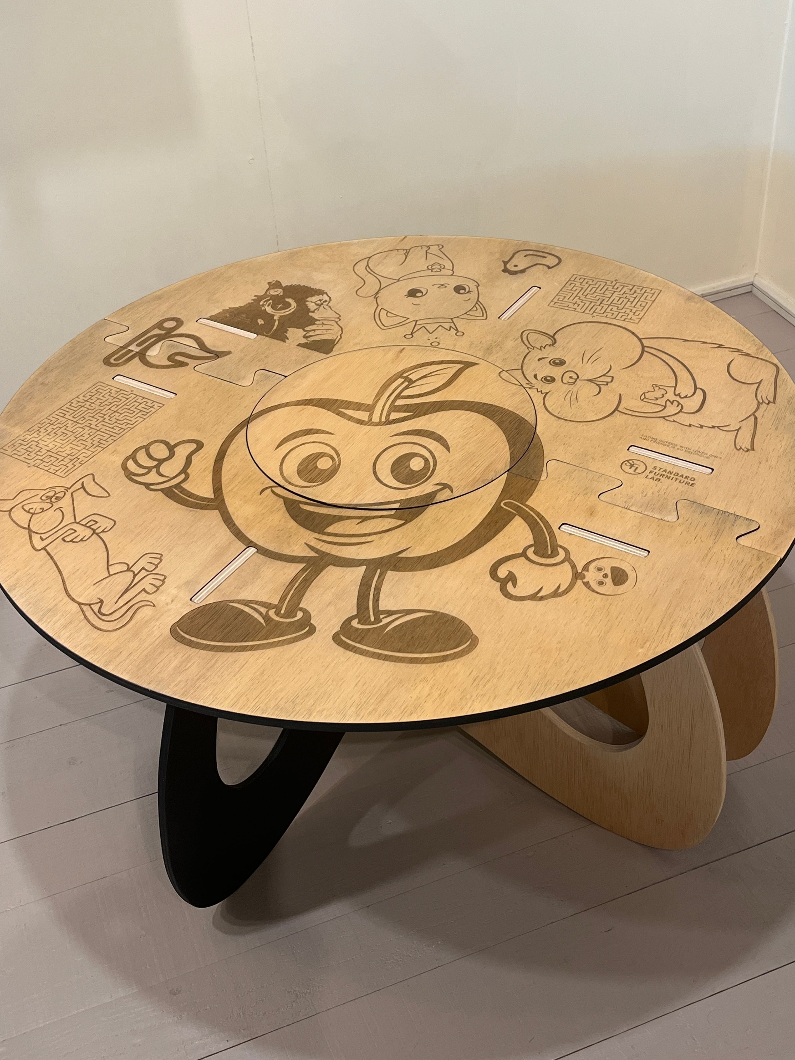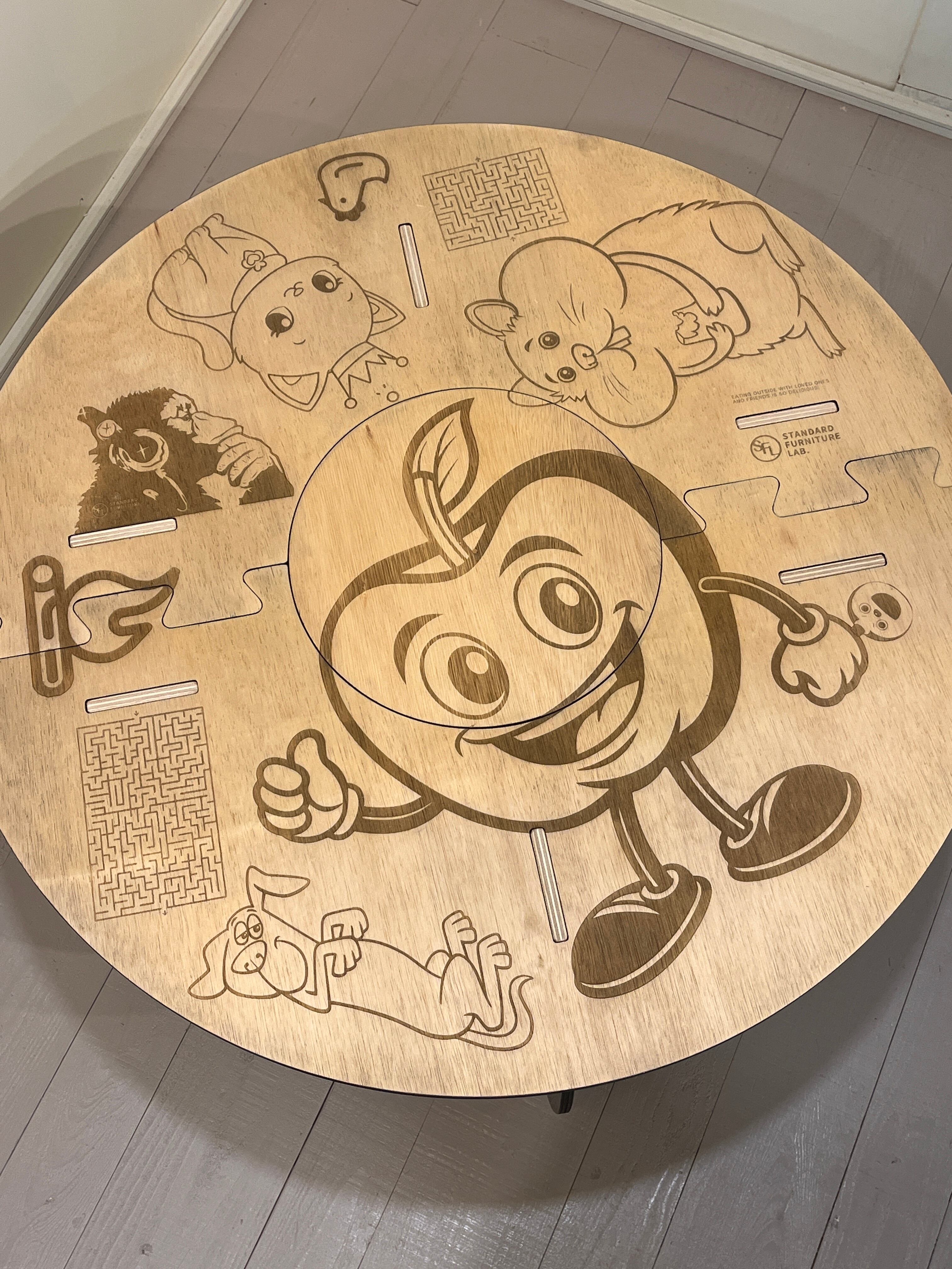 こちらは〈限定〉のリンゴちゃんデザインとなります。また、テーブル面はリバーシブルでイラスト面とブラック面の両方で楽しめます。