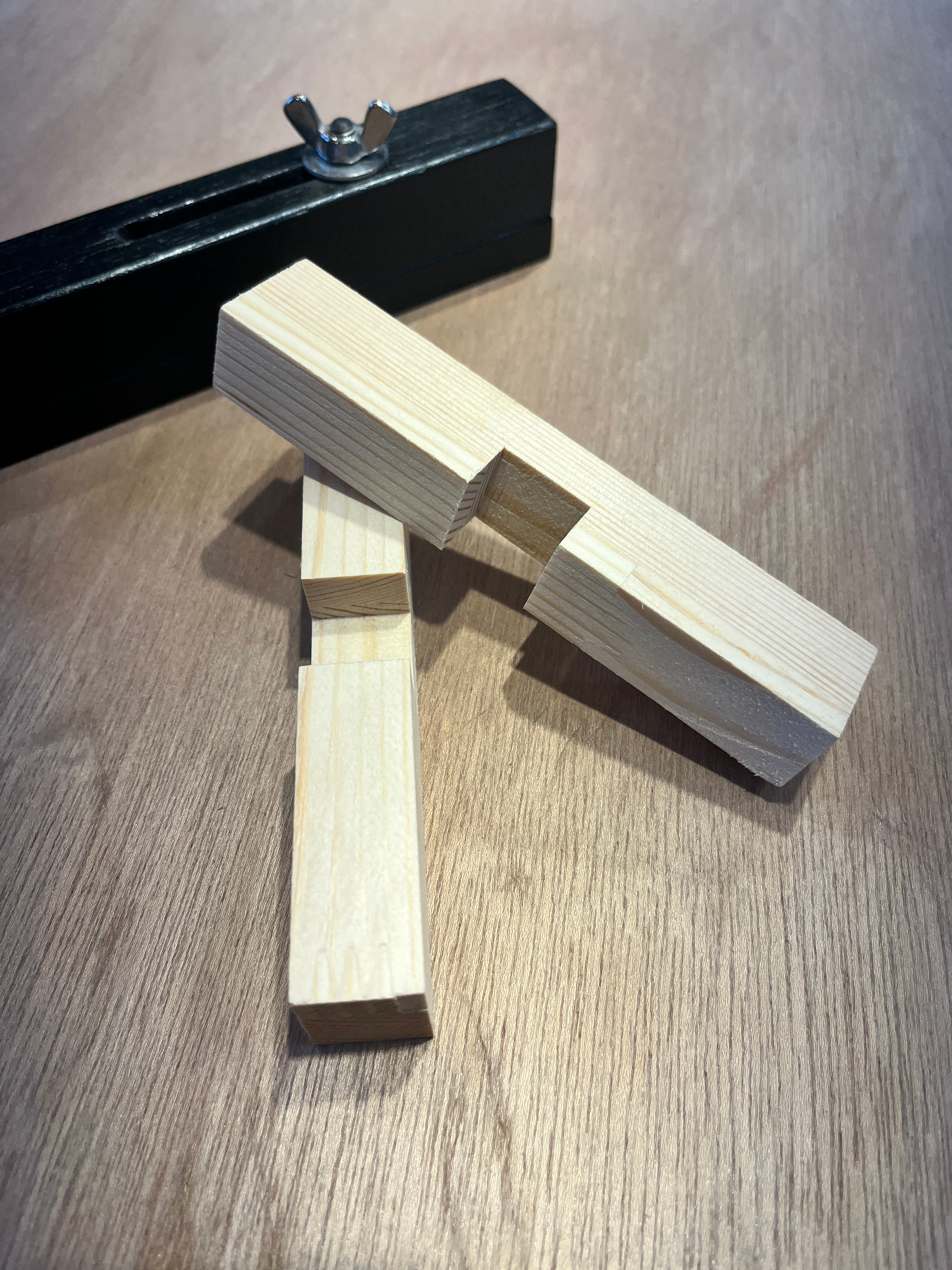 この治具は材料と使用する工具の歯の厚みを記憶させ、正確にピッタリと組み合わせることが出来るとても便利なものです。しかも調整ネジを開け締めすることでコンマ数ミリの調整が可能です。キツめ、ユルめ、キツ過ぎずユル過ぎずなど繊細な加工も思いのままです。
